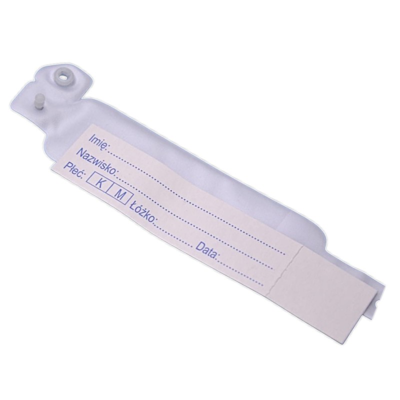 Zapinana na zatrzask opaska identyfikacyjna dla dorosłych. Wykonana z delikatnego tworzywa nie powodującego uczuleń ani odparzeń. Charakteryzuje się odpornością na wilgoć, działanie mydeł, środków do dezynfekcji rąk i innych cieczy stosowanych w szpitalach. Posiada 5 pól do wypełnienia (imię, nazwisko, łóżko, płeć, data).