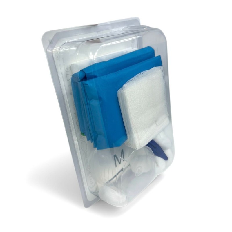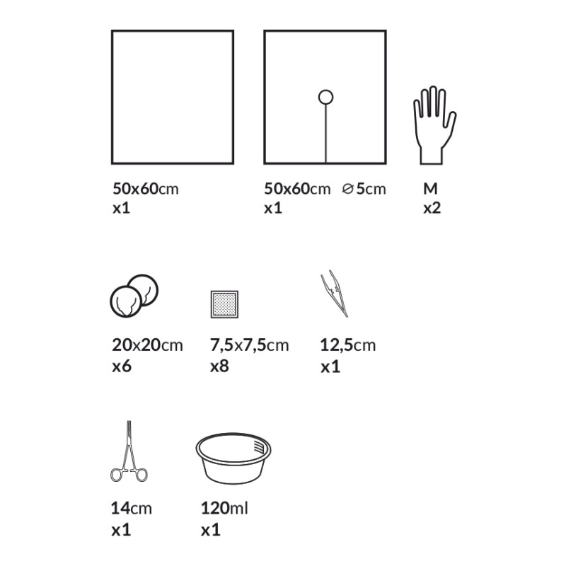 - 1 szt. serweta chirurgiczna 2-warstwowa, z centralnym otworem i przecięciem 50cm x 60cm; otwór: śr. 5cm; włóknina polipropylenowa + folia polietylenowa nieprzemakalna; kolor niebieski