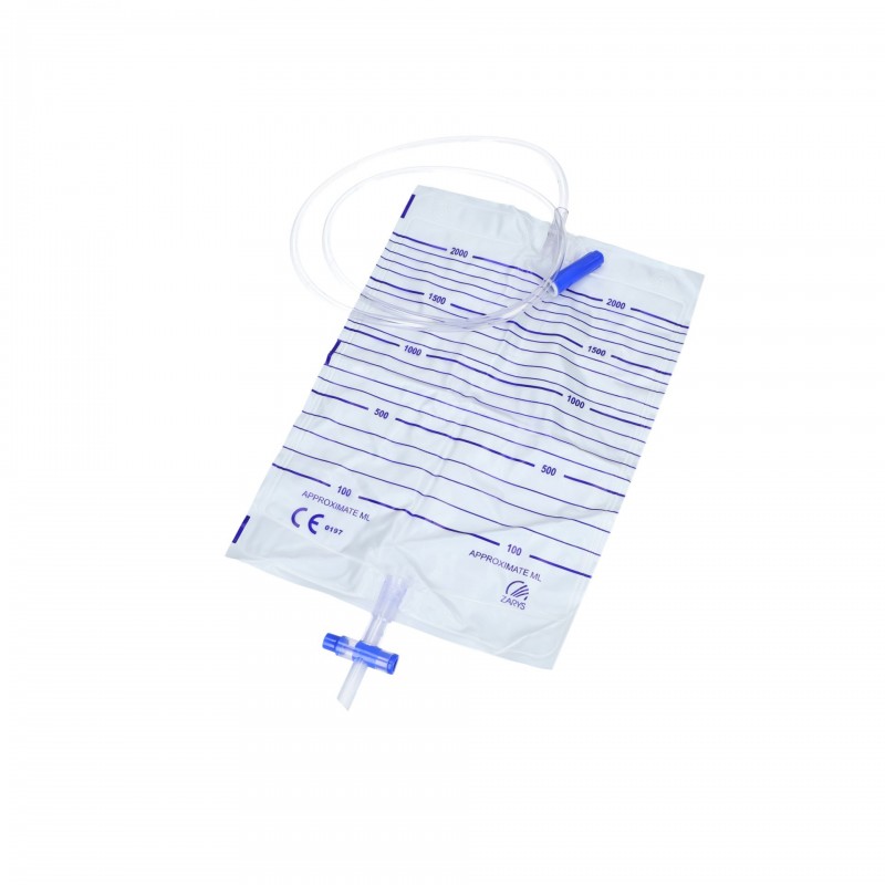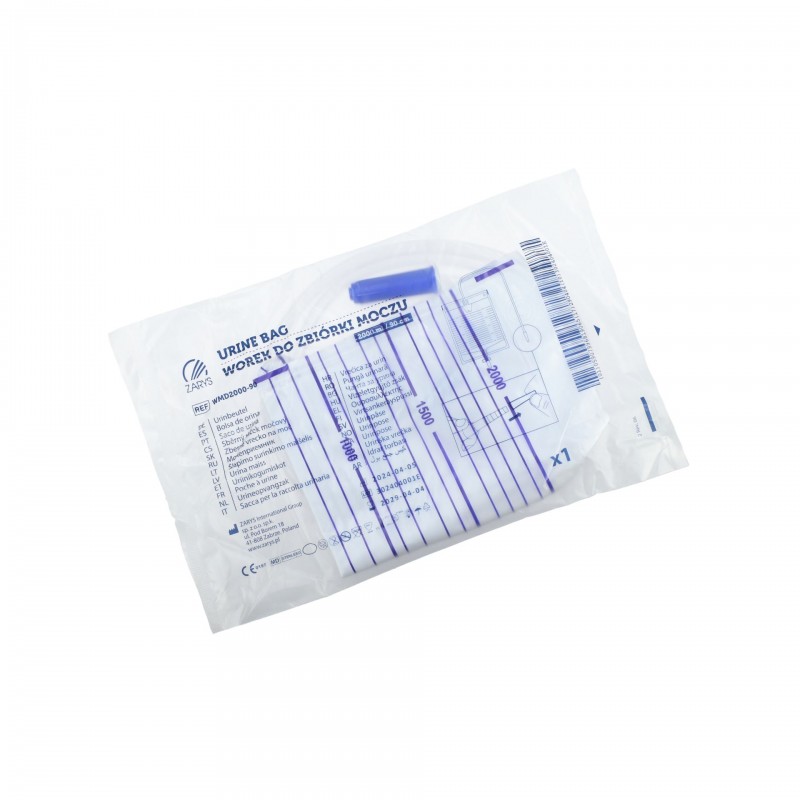 Bezlateksowy worek do zbiórki moczu o pojemności 2L wykonany z PCV z podwójnie zgrzewaną folią oraz skuteczną zastawką antyrefluksyjną. Wyrób z drenem wykonanym z materiału zapobiegającemu zaginaniu i skręcaniu się, przeznaczony do dobowego, pozaustrojowego zbierania moczu i innych płynów ustrojowych.