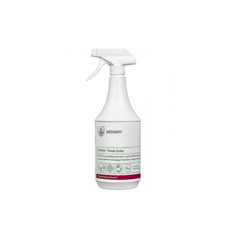 Velox Foam Extra 1L to gotowy do użycia, bezalkoholowy preparat przeznaczony do mycia i dezynfekcji powierzchni sprzętu medycznego wrażliwego na działanie alkoholu. Płyn w postaci piany wytwarzanej za pomocą dyszy pianotwórczej.