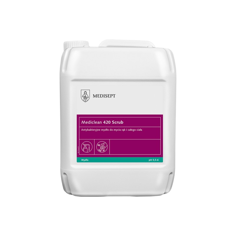 Mediclean 420 Scrub to wysokiej jakości mydło antybakteryjne w płynie, delikatnie nawilżające dzięki zastosowaniu łagodnych środków myjących i uszlachetniających do mycia rąk i całego ciała. Nie zawiera barwników ani kompozycji zapachowej. Neutralne dla skóry pH oraz zawartość gliceryny i pochodnej olejku kokosowego pozwala na codzienne mycie rąk nie powodując podrażnień. Produkt do zastosowania w przemyśle spożywczym, instytucjach służby zdrowia, szkołach, przedszkolach oraz restauracjach.