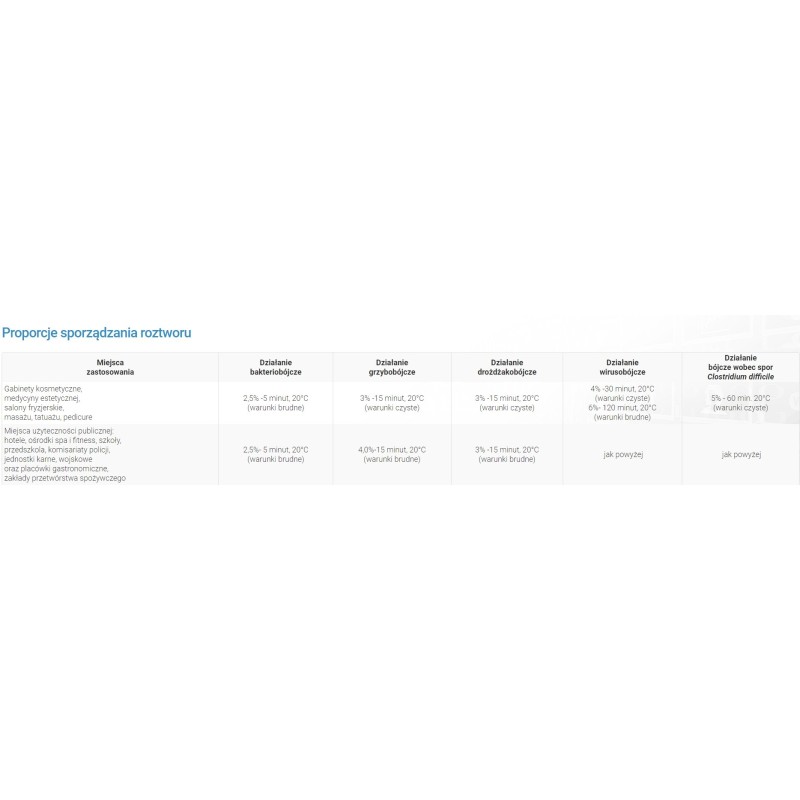- Dezynfekowane narzędzia pozostawiamy w roztworze na czas oznaczony w tabelce powyżej. Czas kontaktu zależy od wybranego zakresu działania. Przykład: w celu dezaktywacji bakterii, grzybów, wirusów i sporów pozostaw narzędzia na 60 min. w roztworze.