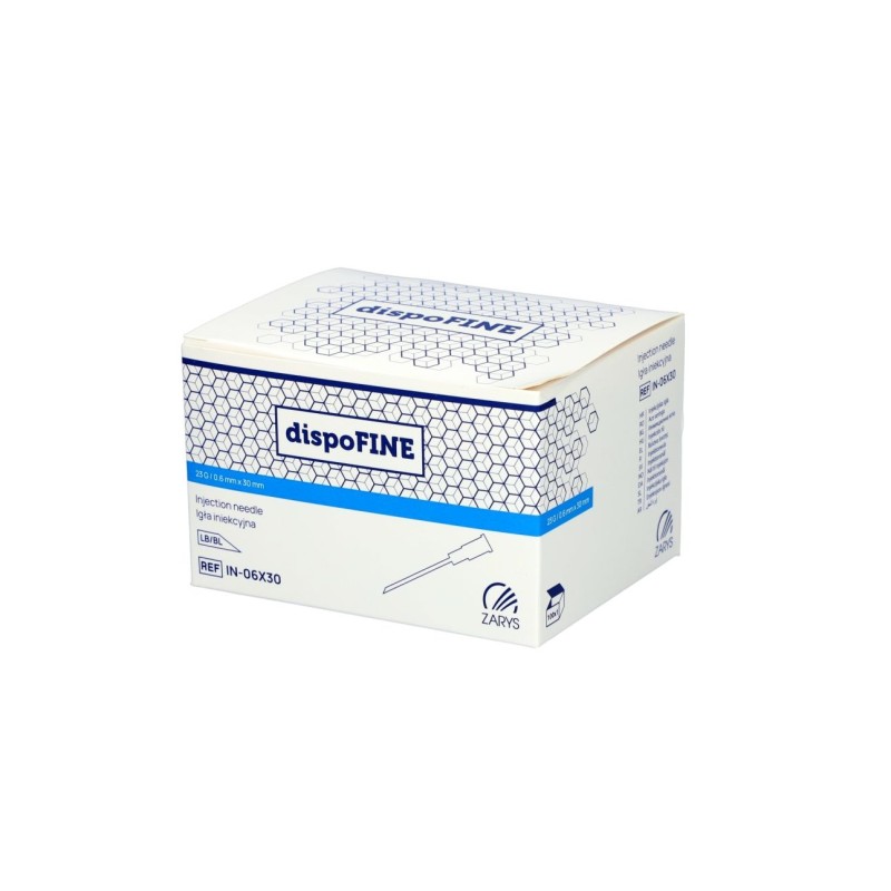 Igła iniekcyjna DispoFine 23G (0,6x30mm), przeznaczona do iniekcji domięśniowych, dożylnych lub podskórnych, mezoterapii i podobnych.
