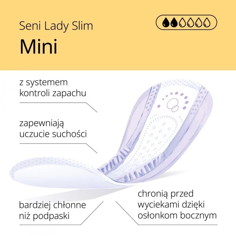 Wkładki Seni Lady Slim Mini to oddychające wkładki urologiczne stworzone z myślą o kobietach prowadzących aktywny tryb życia, ceniących sobie komfort i bezpieczeństwo połączone z dyskrecją. Wkładki cechują się chłonnością na poziomie 2/6 kropli. Doskonale sprawdzą się przy lekkim nietrzymaniu moczu, gdy wycieki są niewielkie i zdarzają się okazjonalnie.