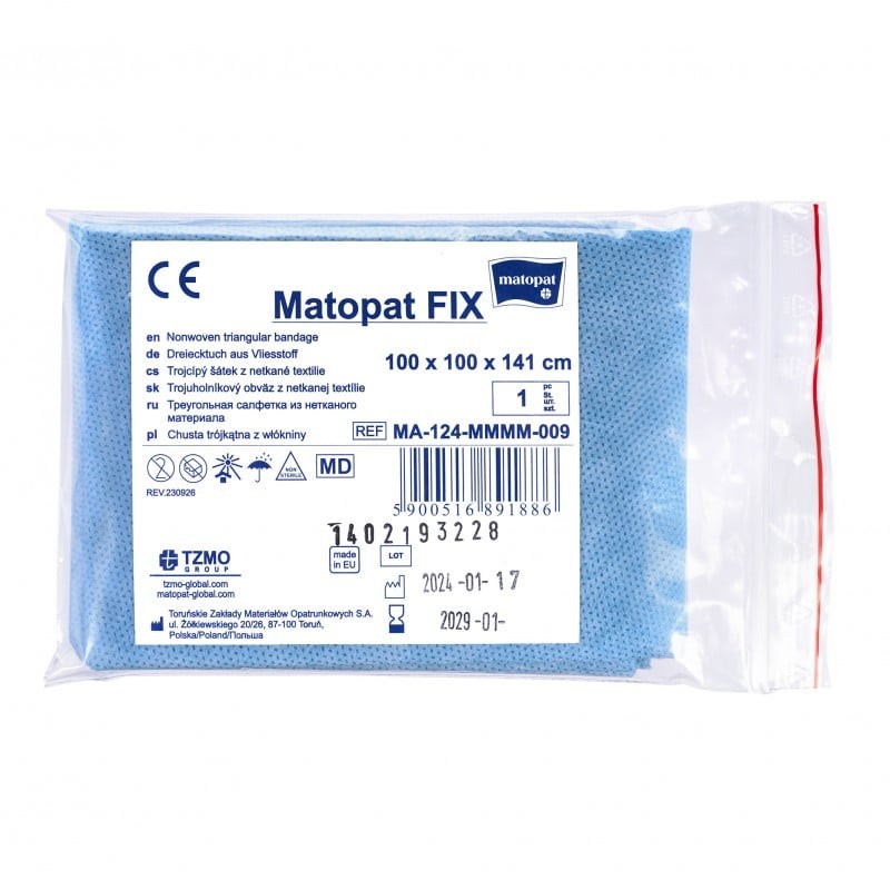 Chusta trójkątna Matopat FIX to produkt wykonany z włókniny polipropylenowej, który znajduje zastosowanie w czasie nagłych wypadków oraz udzielania pierwszej pomocy. Służy do tymczasowego unieruchomienia i podtrzymywania kończyny w przypadku zwichnięć lub złamań obojczyka, kości ramieniowej, przedramienia lub dłoni. Chusta może być stosowana przez osoby dorosłe i dzieci.