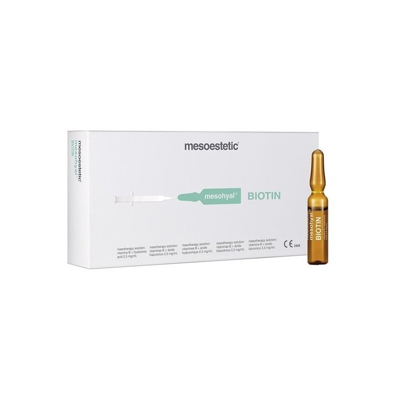 Mesohyal™ Biotyna to rewitalizujący roztwór na bazie kwasu hialuronowego, zawierający biotynę i kompleks witamin z grupy B. Roztwór w 2ml ampułkach o działaniu regenerującym oraz hamującym wypadanie włosów. Stymuluje metabolizm komórkowy, a co za tym idzie zwiększa przyswajalność innych substancji aktywnych dostarczanych w głąb skóry. Zapobiega nadmiernemu wypadaniu włosów lub zmniejsza jego intensywność w przypadku obecności problemu. Działa również spowalniająco na procesy starzenia się skóry przywracając jej naturalny blask.