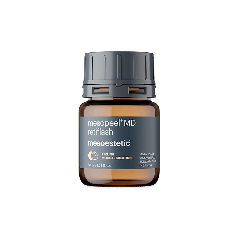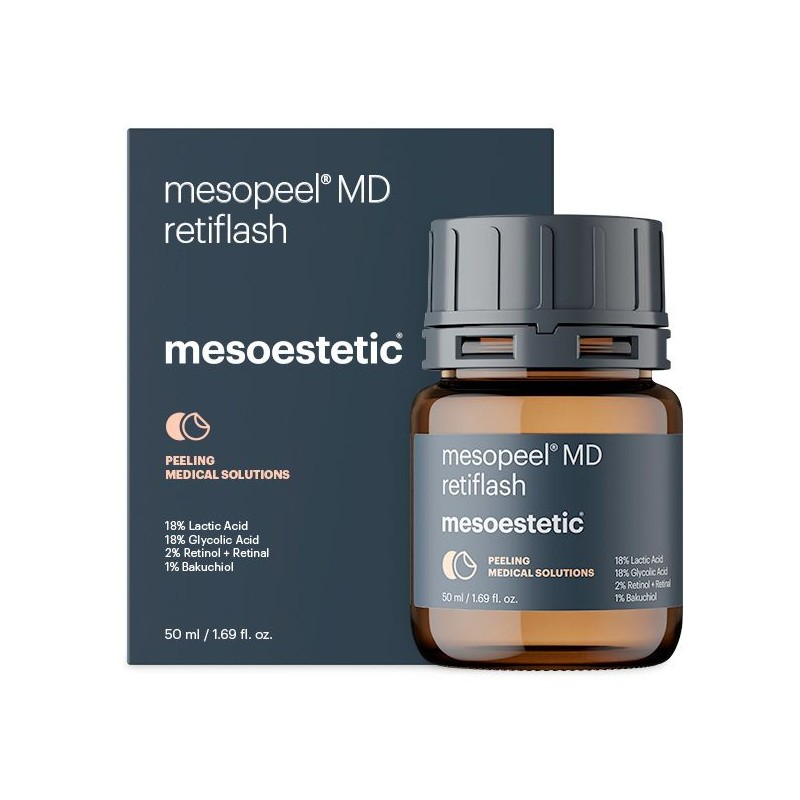 Mesoestetic mesopeel MD Retiflash to medyczny peeling rozświetlający, który zapewnia natychmiastowy efekt glow. Ożywia koloryt skóry i rozjaśnia cerę, niwelując niedoskonałości.