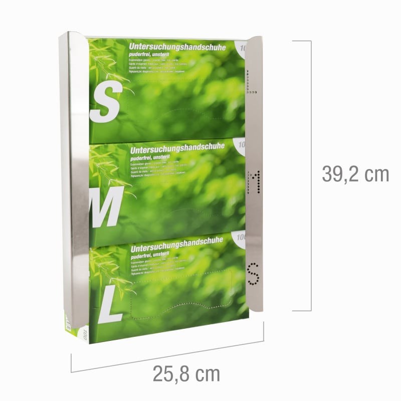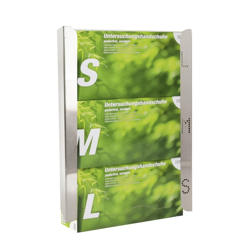 Dozownik na rękawiczki medyczne ze stali szlachetnej nie tylko bezpiecznie przechowuje opakowania rękawiczek medycznych, lecz również pomaga zachować porządek w pomieszczeniu. Praktyczne oznakowanie rozmiaru rękawiczek na boku dozownika pozwala na szybkie wybranie odpowiednich rękawiczek. Dozownik można bez problemu dezynfekować za pomocą środków do dezynfekcji powierzchni.