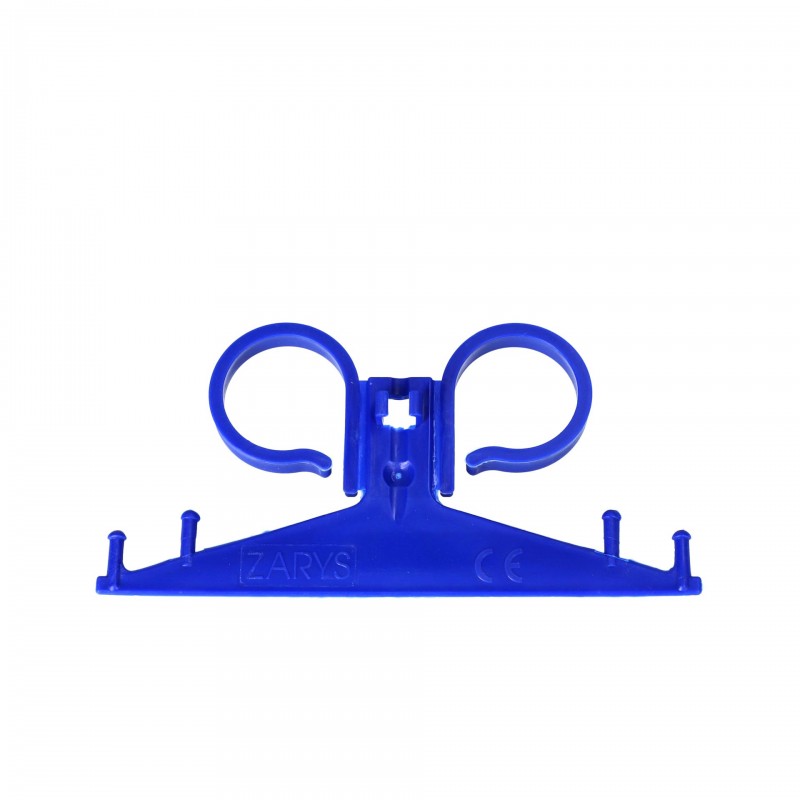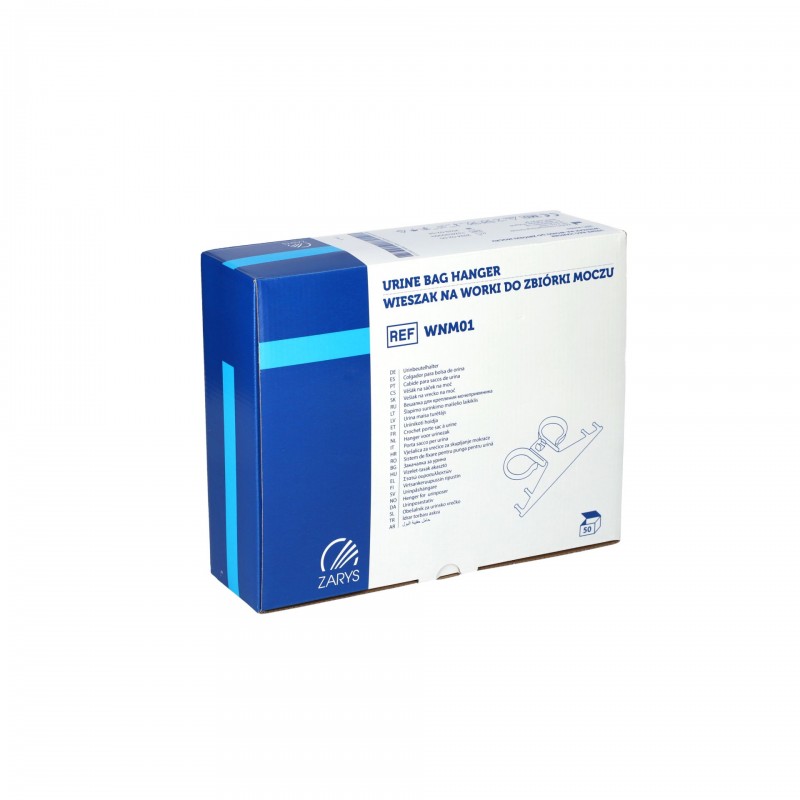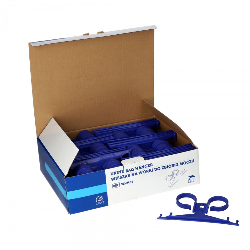 Wieszak wykonany z trwałego tworzywa bez zawartości DEHP. Wyposażony w klamrę do mocowania drenu, która zapobiega jego załamywaniu się. Pasuje do ram o profilu okrągłym i kwadratowym. Kompatybilny do standardowych worków do zbiórki moczu.