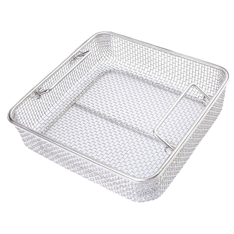 Kosz metalowy, perforowany, o wymiarach 250x250x70mm przeznaczony do sterylizacji narzędzi drobnych, ostrych, lub narzędzi o nieregularnych kształtach.
