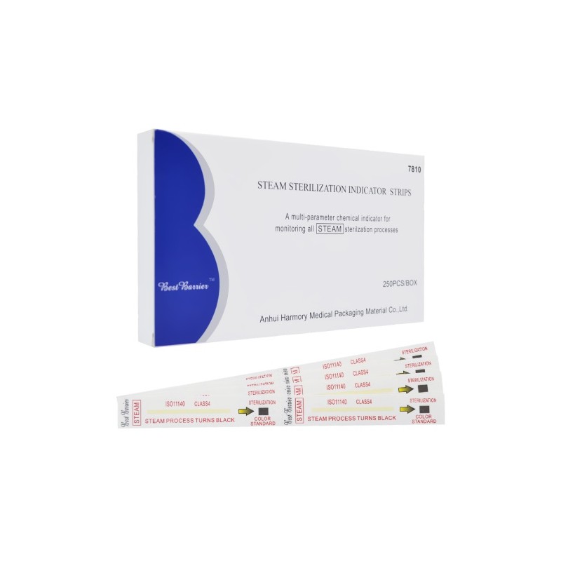 Testy paskowe chemiczne, do kontroli sterylizacji. Przeznaczony do skutecznej kontroli parametrów krytycznych sterylizacji parą wodną i jej penetracji podczas procesu. Podczas sterylizacji parowej wskaźnik na końcu paska zmienia kolor z żółtego na czarny. Nadaje się do używania w sterylizatorach parowych każdego typu. Jest zgodny z ISO 11140-1 jako test klasy 4. Każdy pasek testowy posiada perforację umożliwiającą przedzielenie go na dwie równe części.